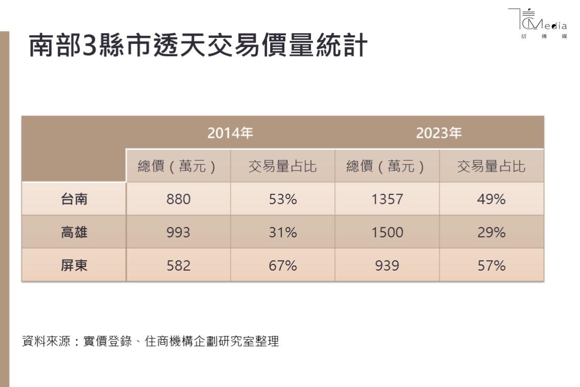 針對南部3縣市透天交易價量表現,住商機構企劃研究室統計實價登錄資料發現,台南市於2014年時,實價上平均透天總價約880萬元,但在10年後平均總價成長為1357萬元,漲幅達54%。高雄市10年前透天平均價位是993萬元,而2023年平均總價也漲了51%,來到1500萬元。至於屏東縣透天漲幅同樣驚人,2014年透天平均成交總價僅為582萬元,但到2023年平均要花939萬元才能買到一棟透天,10年漲幅高達61%。