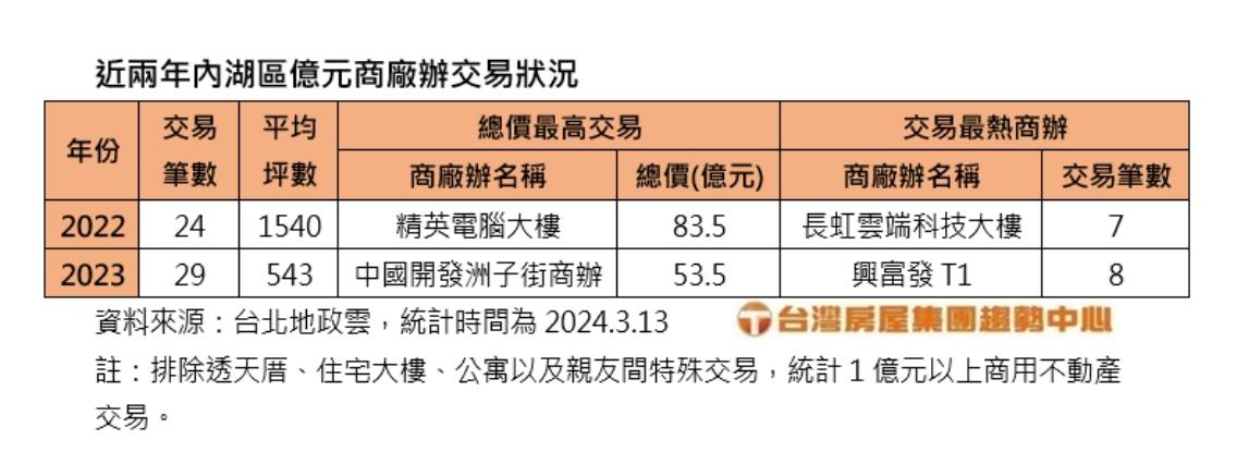 商用型不動產,尤其是台北內湖的廠辦交易穩健,台灣房屋集團趨勢中心統計,近兩年內湖億元以上商辦及廠辦交易,2022年共24筆,總銷逾220億;而2023年則有29筆,累計總銷超過110億,其中坐落於內湖科學園區的交易就有14筆。交易最熱門的商辦包括新完工的安康段「興富發T1」,共有8筆交易,位在舊宗段的「聯虹識野科技大樓」,屋齡僅2年,共交易4筆、最新揭露去年11月交易低樓層廠辦,總價約2.01億元、單價56.6萬元,共391.21坪,由控股公司進駐。