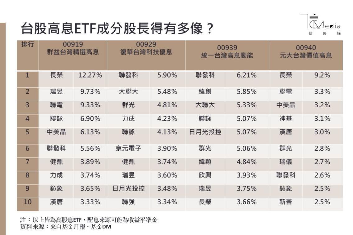 第一,觀察近期幾檔熱門的投資標的,包括00919、00929、00939、00940等相當受歡迎的高股息ETF,攤開其前十大成分股,都有不少重疊持股,雖然各家投信ETF也會搭配其他選股策略,但大致上也脫離不了部分持股重疊,容易衍生成大家一起買把股價推高、互相抬轎,若遇到行情出現反轉大回跌,一旦面臨權重調整,賣壓也會隨之出現。