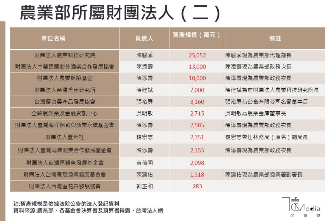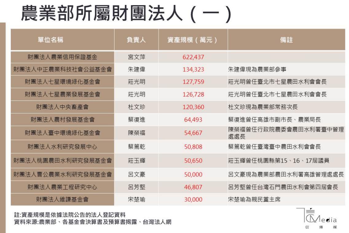 另外,農村發展基金會、台中環境綠化基金會、水利研究發展中心、桃園農田水利研究發展基金會、曹公農業水利研究發展基金會、農業工程研究中心、維謙基金會、農業科技研究院、中華民國對外漁業合作發展協會、農業保險基金等,其資產規模也同樣達到上億元。