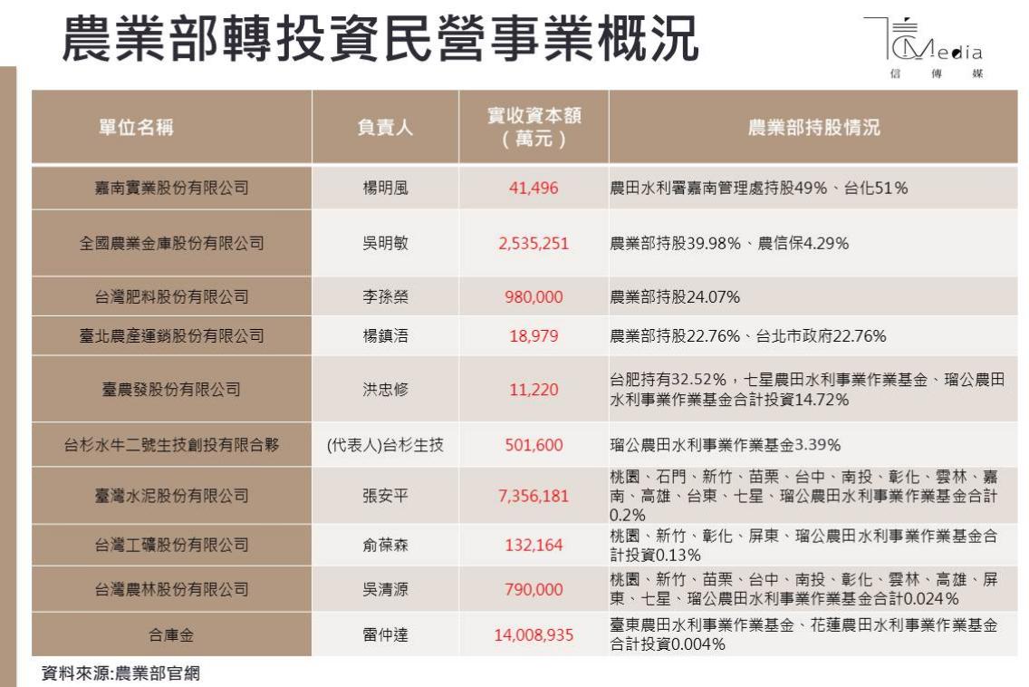 除了財團法人之外,由農業部主管的政府轉投資民營事業,其中轉投資事業高階經理人的人事安排也格外引起矚目,細數農業部轉投資的民營事業共有10家,其中包括台肥、台泥、農林、合庫金皆是上市公司。