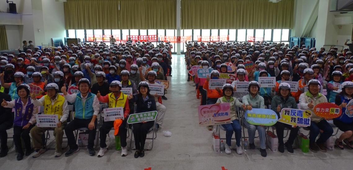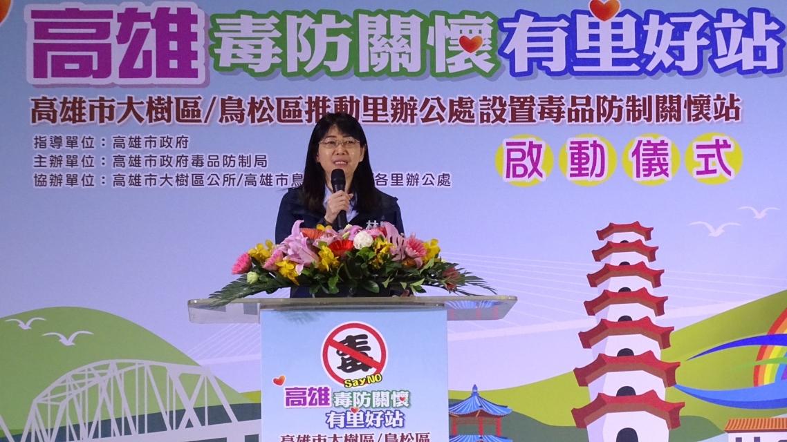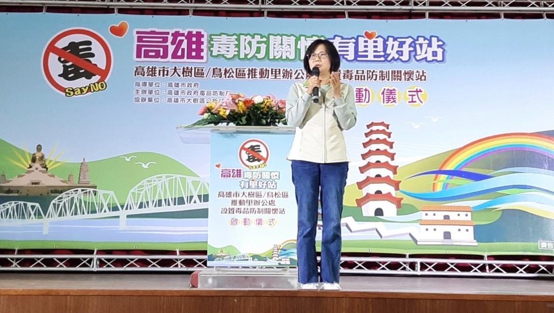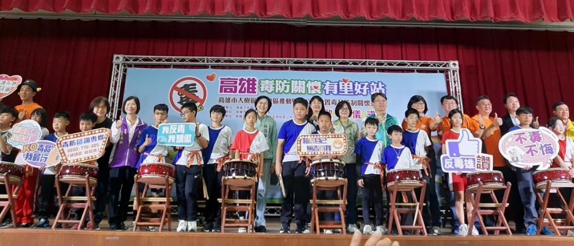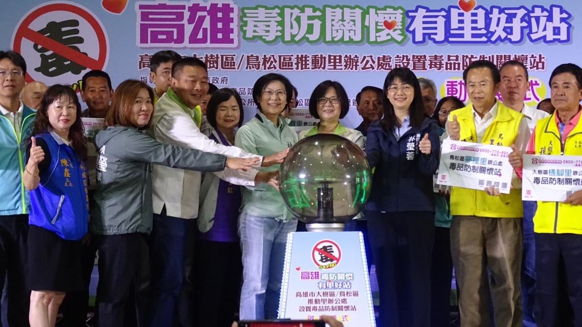 高雄市政府毒品防制局持續推動首創「里辦毒品防制關懷站」,18日於大樹區公所舉辦大樹、鳥松兩區 25 里辦公處毒品防制關懷站成立啟動儀式,由楊區長及大樹區孫國憲里長主席、盧區長及鳥松區陳萬丁里長主席率領的25 位里長、鄰長、志工隊、巡守隊等逾 450 位 里民熱情相挺,林岱樺立委、江瑞鴻議員、黃飛鳳議員也親自出席致詞支持,邱議瑩立委代表、邱俊憲、張勝富、吳利成議員代表及仁武分局副分局長、水寮國小校長、家長會長均到場支持響應,大家戴上毒防局特製反毒雄讚安全帽,齊力宣誓反毒。