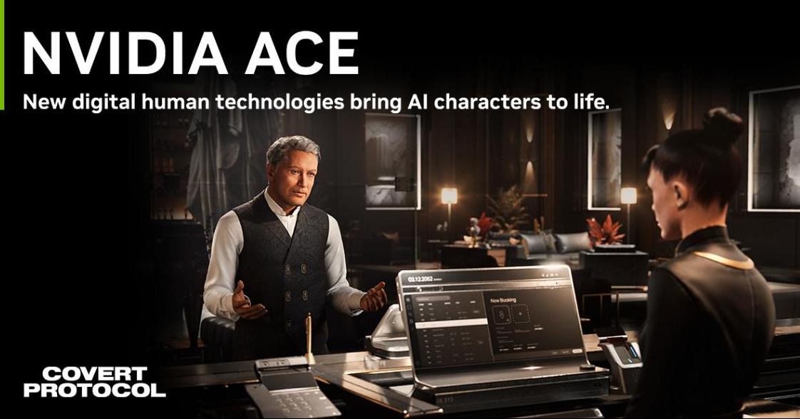 NVIDIA ACE 這套技術用於創作出栩栩如生的遊戲人物角色。Inworld AI 與 NVIDIA 合作開發出的全新技術展示內容《Covert Protocol》,突破了遊戲中角色互動的界限。Inworld 的AI引擎整合了 NVIDIA Riva 和 NVIDIA Audio2Face,前者能夠做到精確的語音轉文字,後者能夠做出逼真的臉部表情。
