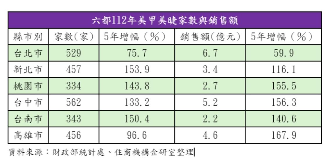 據財政部統計處最新資料,美甲美睫業112年家數已達3523家,銷售額則約30億元,兩者與107年數據相比,成長幅度皆達1.2倍以上。以六都區域來看,台北市不管是家數、銷售額都是全台之最,不過家數、銷售額5年漲幅在六都中都敬陪末座。反觀新北市的112年家數達457家,5年來成長超過1.5倍,漲幅冠居六都,顯示區域內美甲美睫業仍屬高速成長期。其餘各都成長也十分驚人。