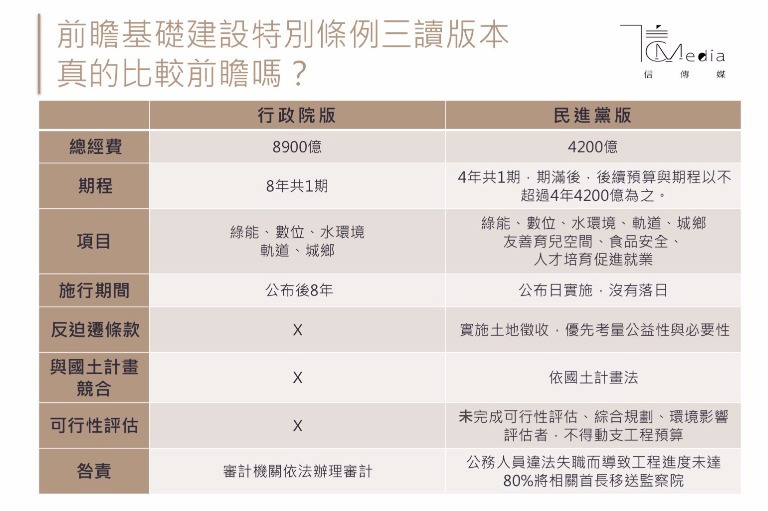 另外,因為程序上應先通過特別條例,再通過計畫,所以他建議行政院應先廢止4月5日的合訂本;而且現在前瞻計畫中又加入少子化、人才培育等新的項目更需要重新擬定新的計畫,分配資源。