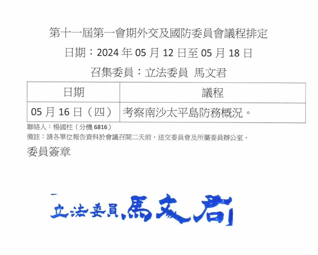 馬文君強調,「不管蔡總統去不去,我們自己去」,她已經確定排程,一切流程程序敲定,預計將在5月16日,蔡總統卸任之前成行。她說,宣示主權、視察工程、犒勞駐軍,「三個目標,一趟滿足」。