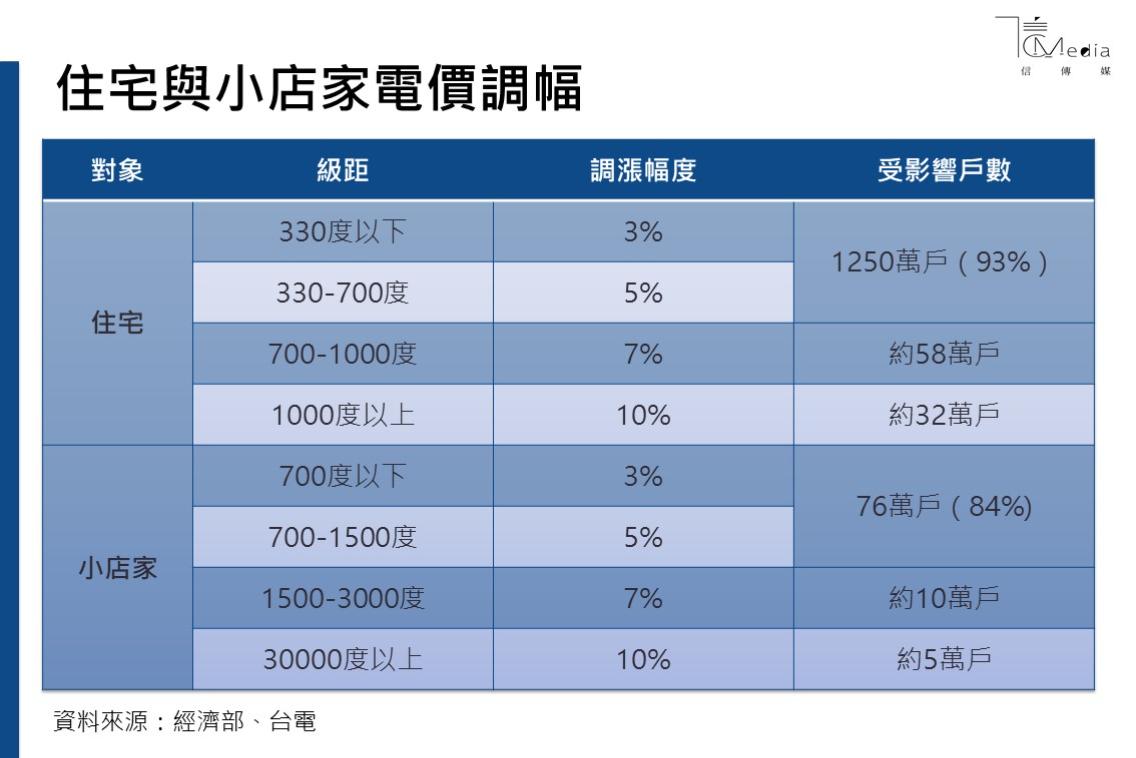 民生用電部分,住宅330度以下、小商店700度以下電價調幅3%,住宅331~700度、小商店701~1,500度電價調幅5%,住宅701~1,000度、小商店1,501~3,000度調漲7%,住宅用電1,001度以上、小商店3,001度以上調漲10%。