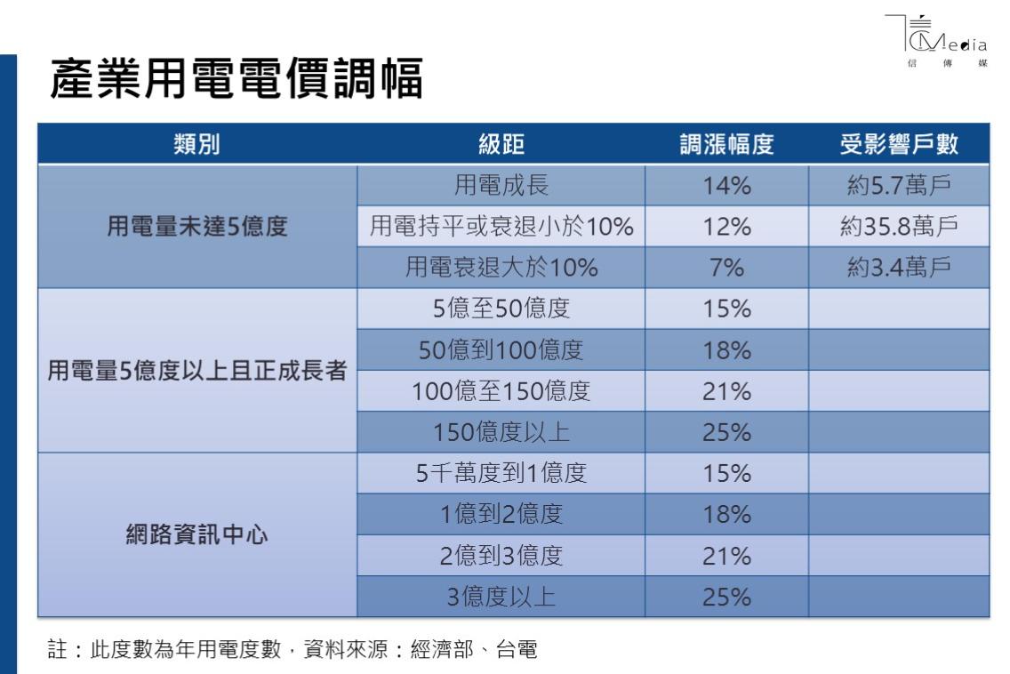 針對產業用電大用戶,以及網路資料中心(Internet Data Center, IDC)高用電者,則採較高調幅以合理反映用電成本,用電量5億度以上且兩年用電平均正成長公司者,以及用電量0.5億度以上之網路資料中心,依用電量規模調漲15%~25%,以有效引導節約用電。