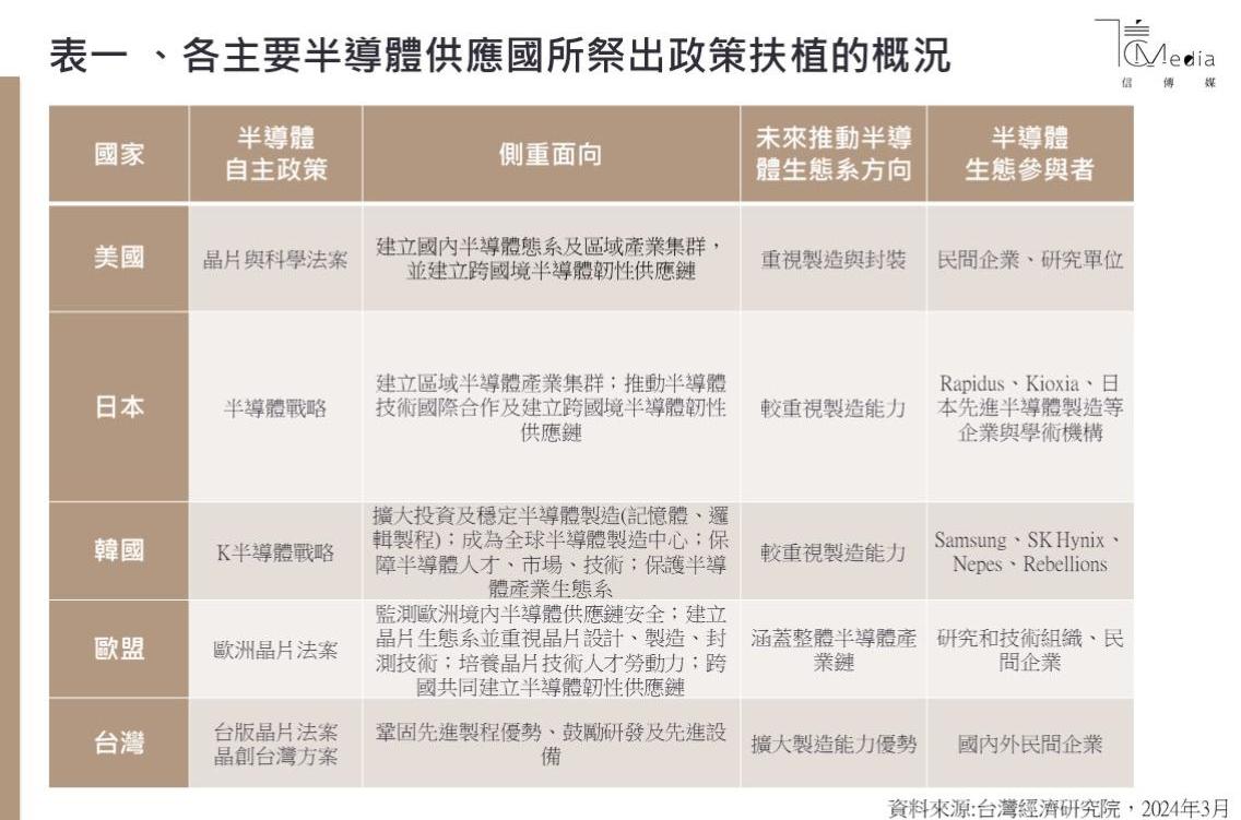有鑑於美中科技戰短期內難停歇,加上全球地緣政治動盪的因素日趨擴大,目前包含俄烏戰爭、以巴戰事、紅海危機、朝鮮半島/兩岸/南海軍事緊張氛圍等,因此各國未防範未來恐有半導體供應鏈斷鏈或是其他供應的風險,故全球主要供應國不斷強化對於半導體扶植政策的力道(請參考表一)。