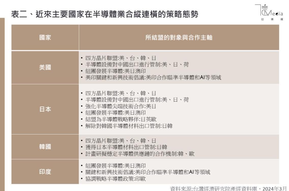 各國合縱連橫策略背後無非就是為追求建立自身半導體競爭力的捷徑,在面對半導體業國際情勢呈現分化及拉攏的格局中,尤須留意台灣的發展空間是否遭到壓縮