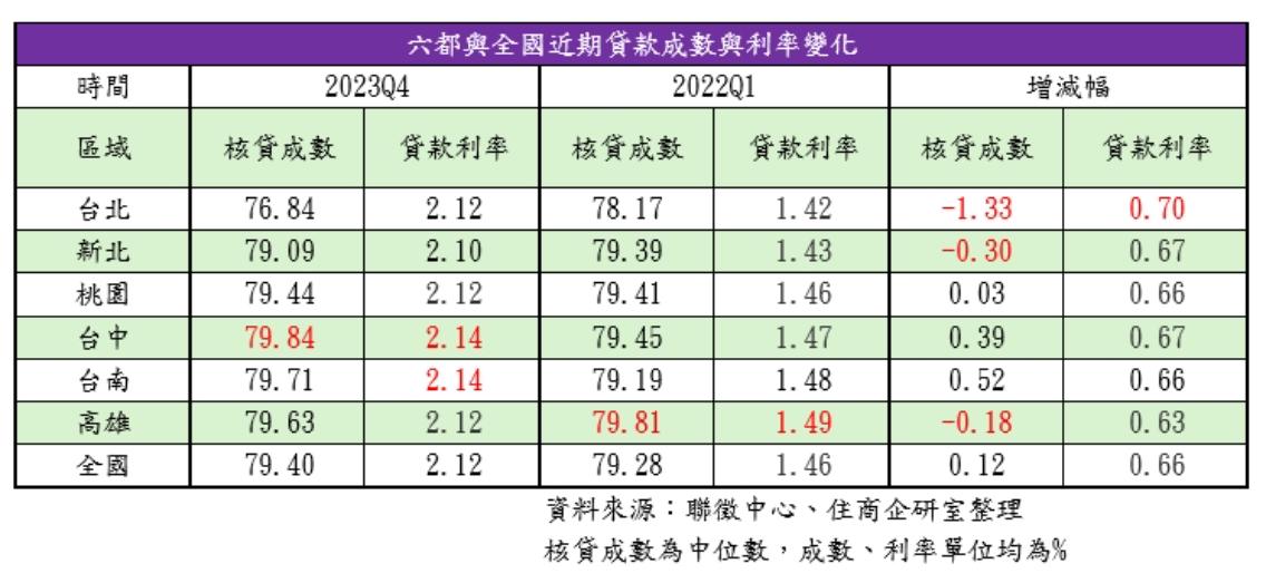央行無預警升息半碼,住商機構彙整聯徵中心最新資料發現,與央行六波升息前的2022年Q1相比,全國核貸成數微增0.12個百分點,利率增加0.66個百分點,其中北市貸款利率增幅與核貸成數跌幅均居六都之首。住商不動產企劃研究室執行總監徐佳馨分析,除利率因升息增加外,核貸成數主要都會各有消長,但仍呈現正成長,顯見銀行對市場仍有一定信心。其中北市老宅、小宅交易比例高,此兩類物件貸款條件差,加上北市新案少,較不易出現整批交屋貸款,導致出現貸款成數偏低,利率卻偏高的狀況。