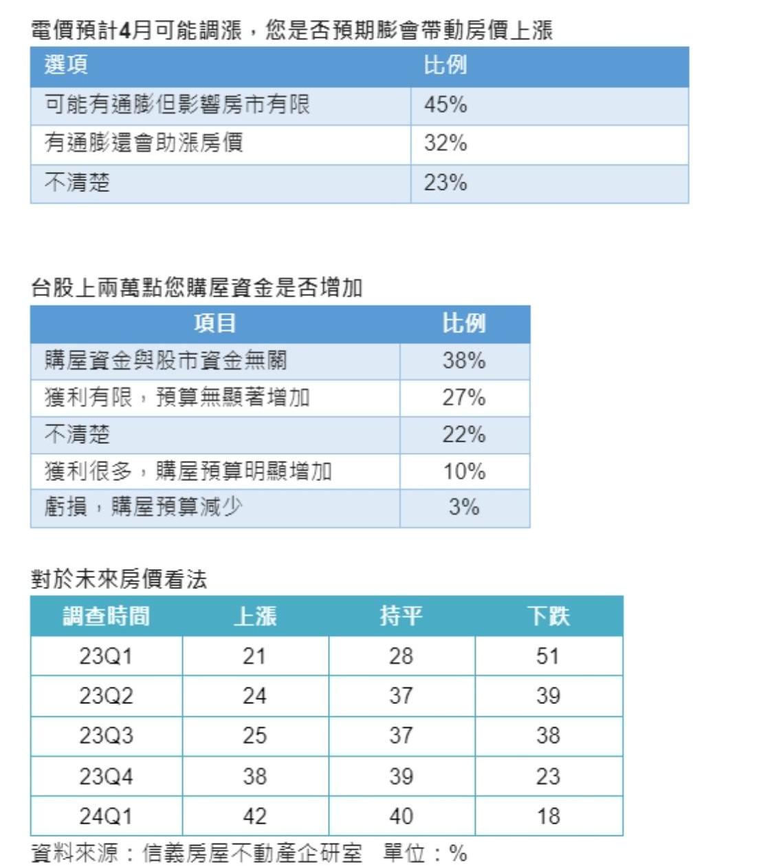 信義房屋針對官網使用者進行2024第二季的購屋意向調查,期間在外有電費調漲、央行升息等事件發酵,不過調查出來結果看漲房價比例達42%,創下近2年以來調查的單季新高,調查中反映部分民眾對於通膨預期強烈,32%受訪者出現通膨會帶動房價的預期,但也有45%相對多數認為雖有通膨,但對房價影響有限,至於今年台股衝破兩萬點,僅有1成受訪者表示獲利很多,購屋預算明顯增加,整體比例並非特別顯著。