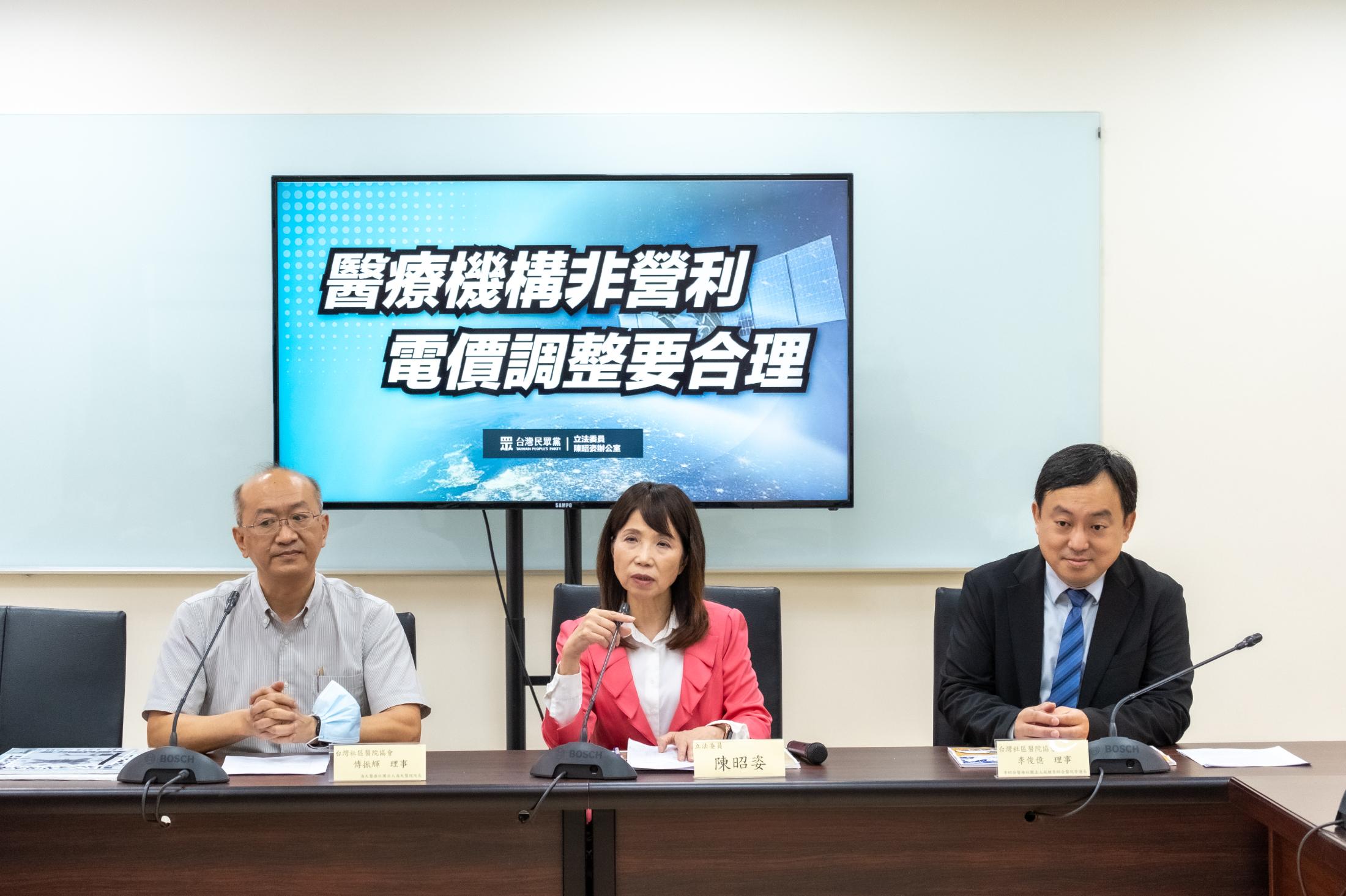 經濟部3月22日召開電價審議委員會,宣布4月起全面調漲電價,台灣民眾黨立委陳昭姿今(26)日與台灣社區醫院協會理事李俊億、傅振輝共同舉行記者會,指出對於提供非營利醫療服務的醫療機構,尤其是各級醫院,此次調價中未見特別討論或考量,忽略了醫院服務的非營利本質。