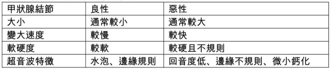 不過甲狀腺結節大多屬於良性的,所以如果發現有甲狀腺結節並不需要太緊張。少數的甲狀腺結節有可能是惡性的甲狀腺癌,所以如果有甲狀腺結節的情況下需要持續在內分泌科密切追蹤。有一些特徵可以幫助我們判斷甲狀腺結節會比較偏向是惡性,例如年紀太大或太小(大於60歲或是小於20歲) 、男性、之前有頸部放射線治療、甲狀腺癌家族史、結節快速變大、結節質地比較硬、吞口水時不會上下移動、有聲音沙啞或吞嚥困難等症狀。