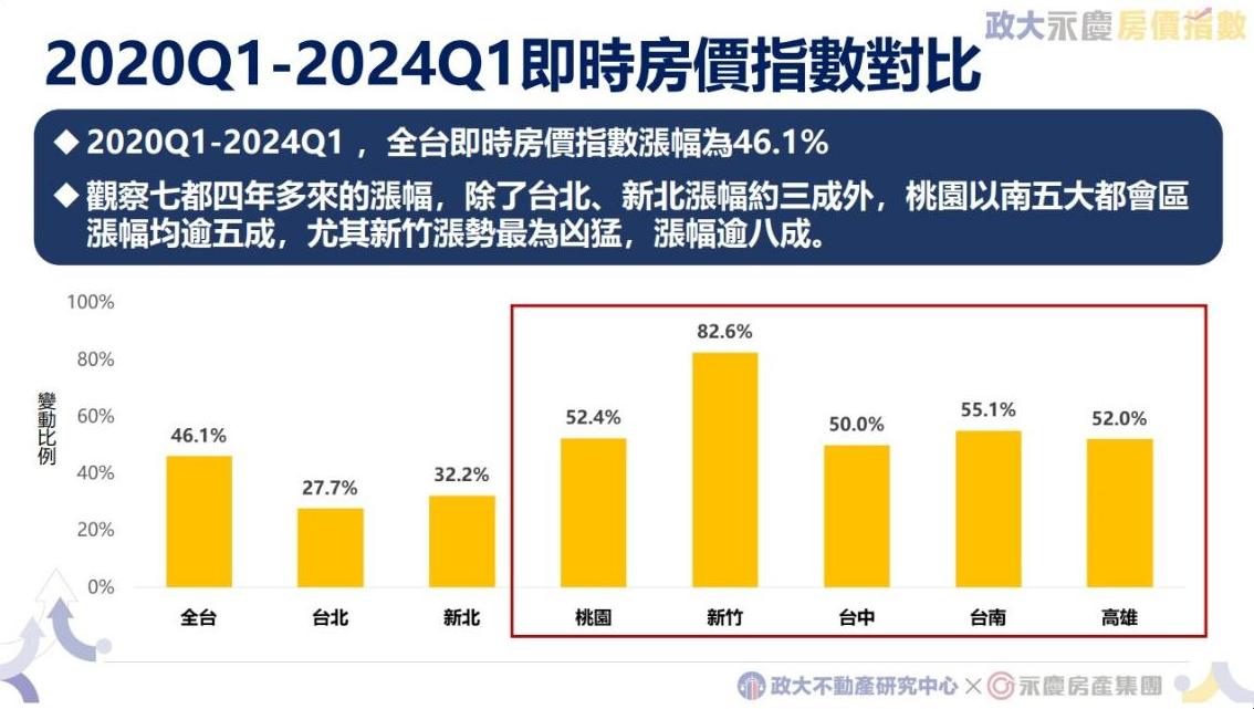 「政大永慶即時房價指數」指出,以台灣最近一波房地產價格開始走揚的2020年作為起點,自2020年Q1至2024年Q1,四年多來全台房價上漲高達46.1%。雙北以外的五都和新竹縣市,更有五成以上的漲幅,