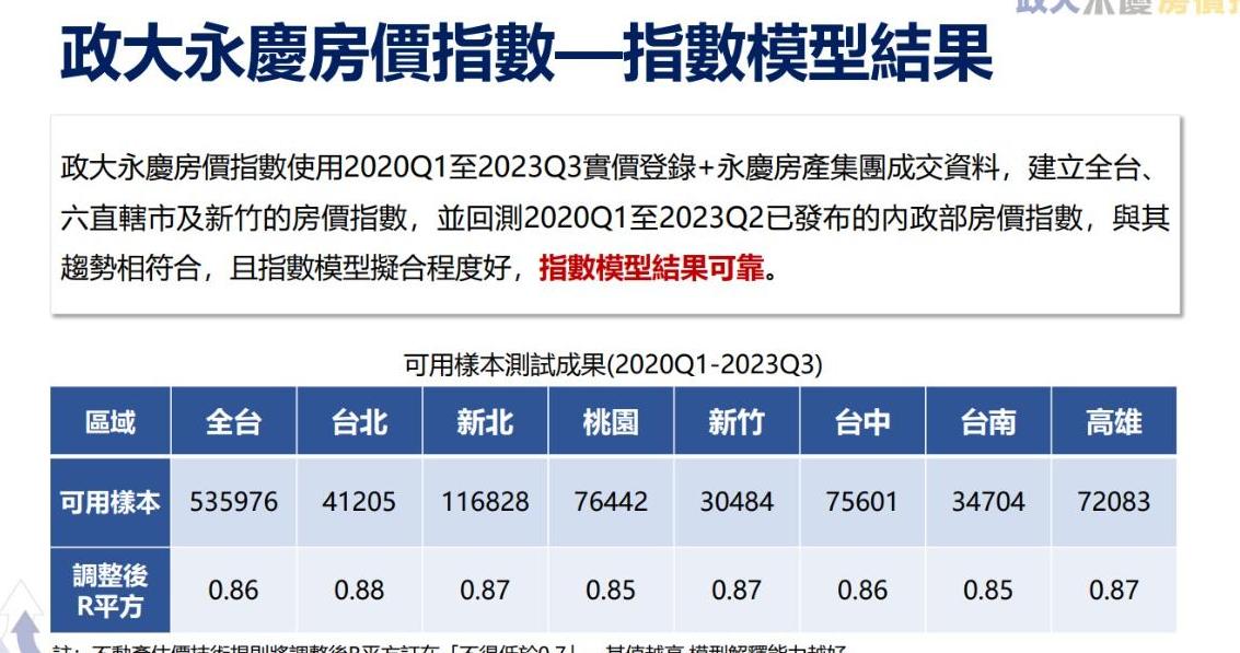 國內第一個全面性的房價指數誕生,政大不動產研究中心和永慶房產集團合作的「政大永慶房價指數」27日正式推出,由永慶房屋提供的53萬筆樣本資料、結合實價登錄,透過政大不動產中心研究能量,分析七都與全台的「即時房價指數」、「七都大樓房價指數」、「雙北公寓房價指數」。