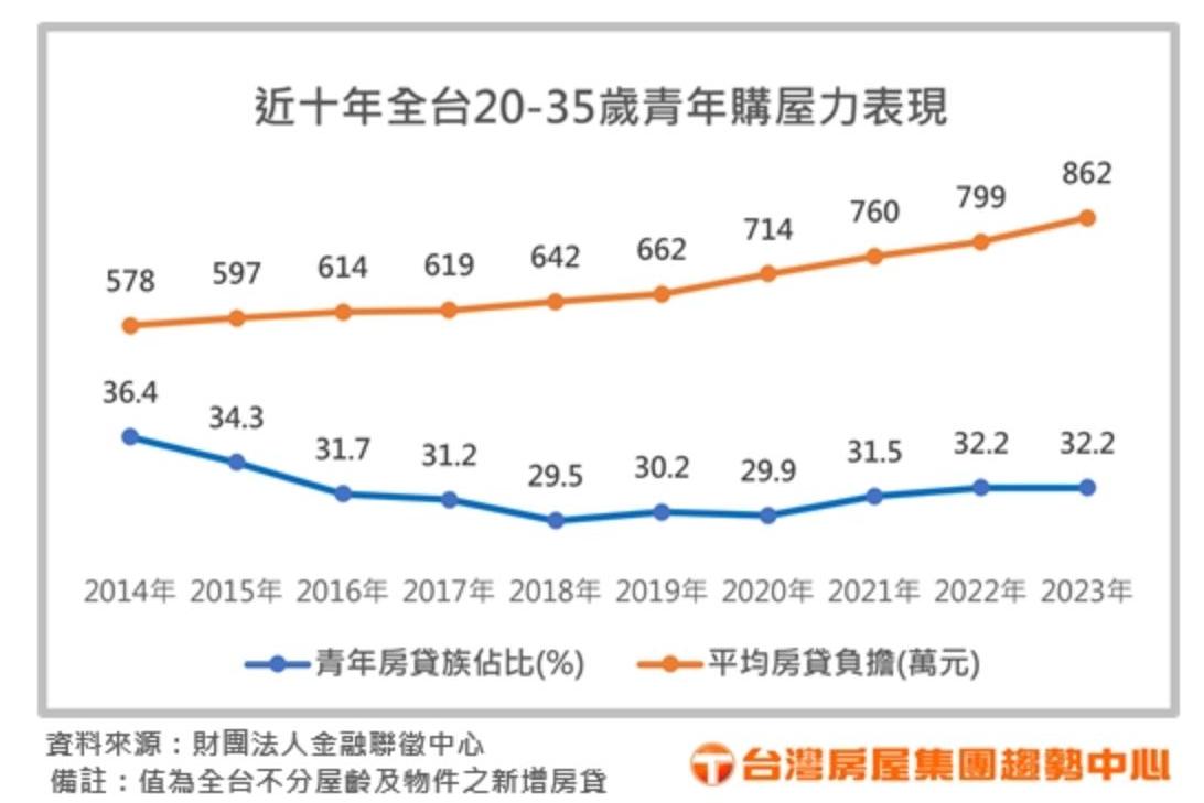 329青年節,但青年快樂嗎?台灣房屋集團根據金融聯徵中心資料統計,全台20~35歲青年2023年平均背負房貸金額為862萬元,房貸壓力創下史上新高!同時,近十年來青年背負房貸金額一路攀升,相比2014年,平均房貸負擔約578萬元,現今Z世代水蜜桃族,房貸壓力比十年前的Y世代草莓族,足足增加了約280萬元。隨房貸壓力年年攀升,也影響青年購屋族比例逐漸下滑,2023年青年房貸族比例約為32.2%,相比十年前減少了約4.2個百分點。