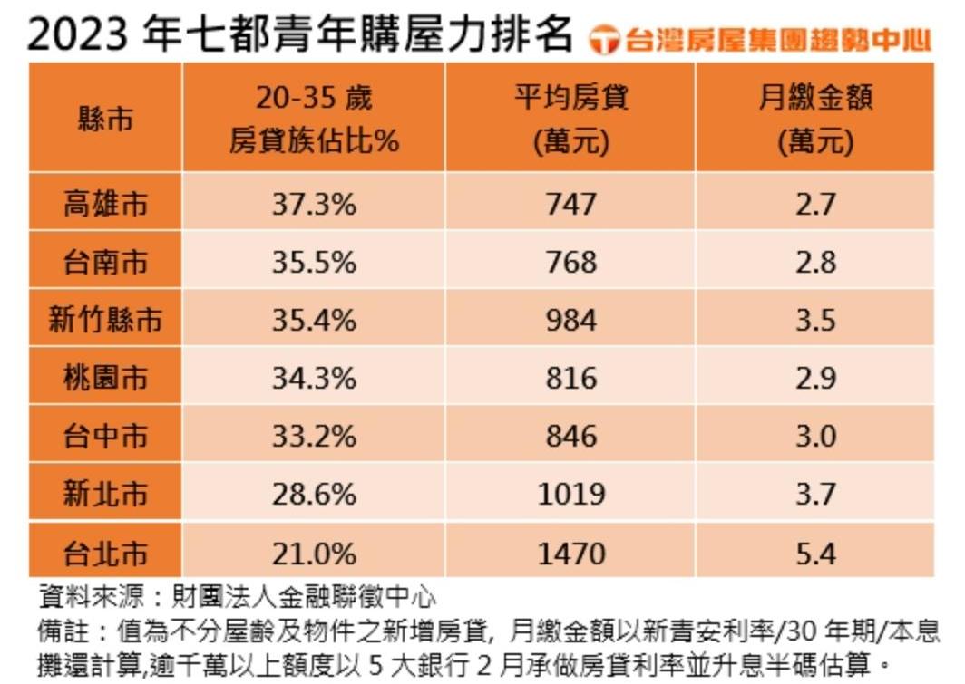 近一步觀察七都青年購屋力,除了雙北,其餘五都青年購屋族佔比均超過3成以上,其中高雄市青年購屋佔比達37.3%,為七都最高,其次依序為台南市、新竹縣市、桃園市、台中市、新北市及台北市,而青年購屋力最高的高雄,平均房貸負擔為747萬元,換算月繳房貸約2.7萬元,皆為七都最輕鬆;而越往中北部走,房貸壓力越來越大,青年購屋力也越來越低,尤其台北市,平均揹負房貸達1470萬元,推算月繳逾5萬元,青年購屋佔比僅約2成,成為七都最苦的駝背族;較獨特的是新竹縣市,青年平均負擔房貸984萬元,月付3.5萬元,壓力僅次於雙北,不過青年購屋佔比仍達35.4%,為七都中房貸壓力雖高,但購屋力仍不減的城市。