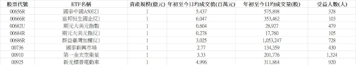 透過證交所ETF投資篩選器可知,截至3月27日為止,約有24檔ETF規模落在1~2億元,其中,包括國泰中國A50反1、富邦恒生國企反1、期元大美元指數、期元大美元指反1、群益臺灣加權反1資產規模僅剩1億元,另外,國泰新興市場、第一金太空衛星、新光標普電動車也同樣僅有1億元,成為低規模風險的ETF。