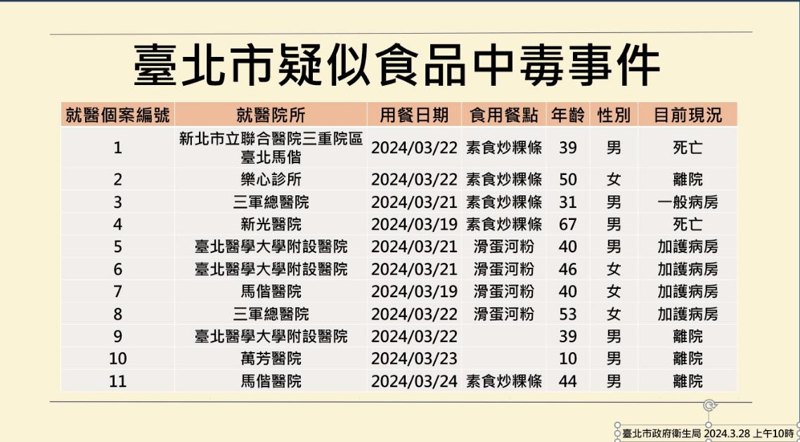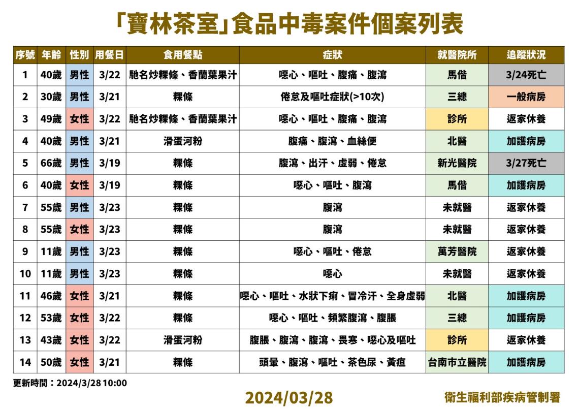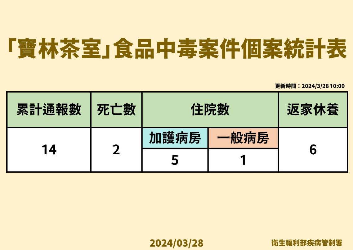 寶林茶室疑食品中毒案持續擴大,衛福部統計有關寶林茶室食物中毒案件調查,截至27日,共計有14名個案與此案件相關,其中2人死亡,6人住院治療中(5人住加護病房、1人住一般病房),6人症狀輕微返家休養。經調查該14名個案皆有攝食寶林茶室炒粿條或滑蛋河粉,目前衛生局仍持續調查中。