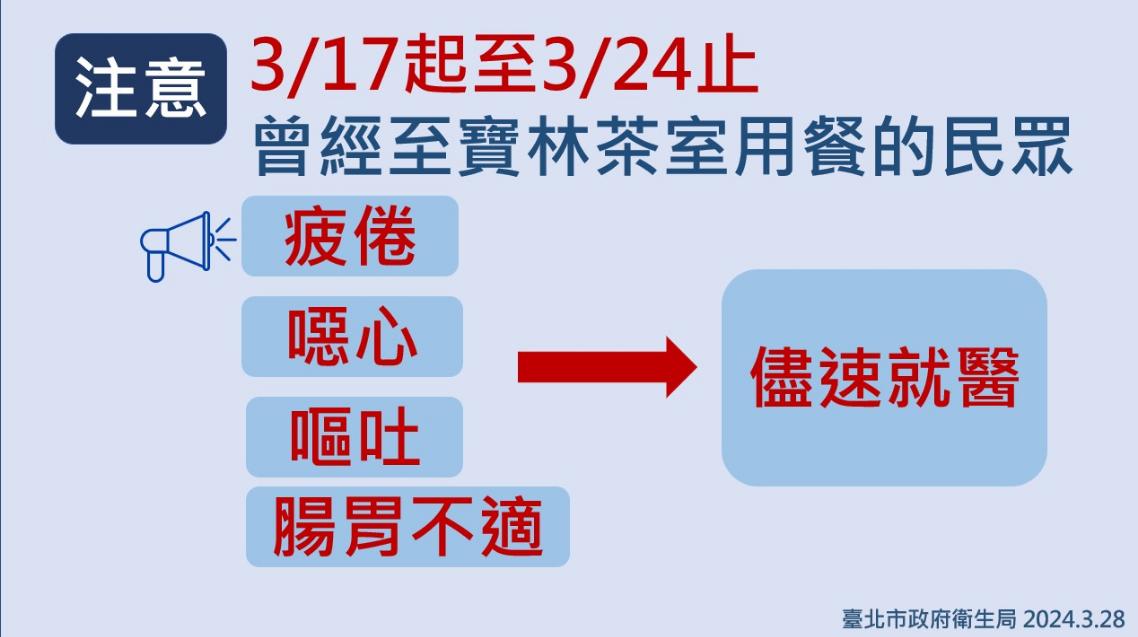 過去幾天曾至寶林茶室用餐者,若噁心腹痛及腹瀉應立刻通報