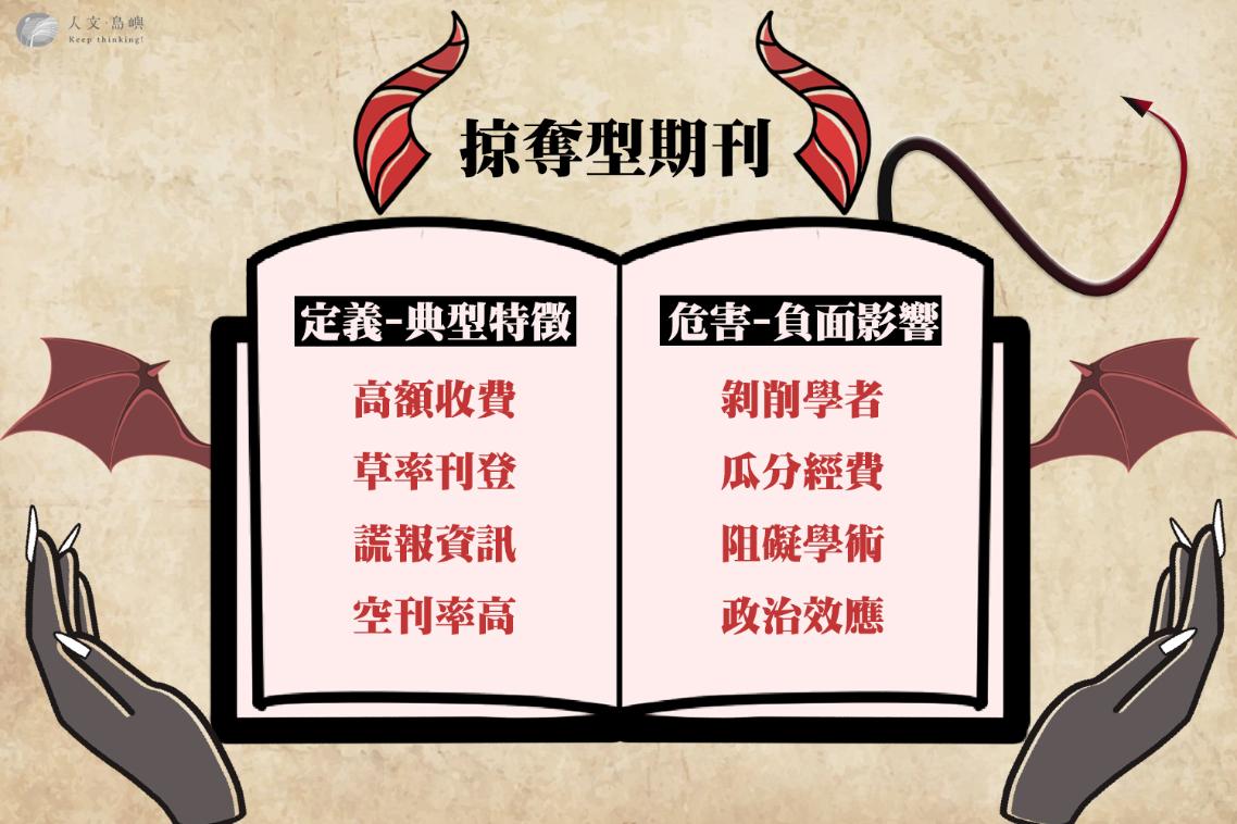 所謂掠奪型期刊,就是罔顧學術出版倫理,以謀取利益為主要經營目標的「偽學術期刊」。這些期刊有時甚至遊走法律邊緣,透過誤導、虛構、欺瞞等手段,誘使學術研究者把心血結晶投稿過來,再強迫收取高額的處理費、出版費或刊登費,就算作者後來發現不對勁而想要撤稿,仍可能無力回天,難以取回文章著作權。