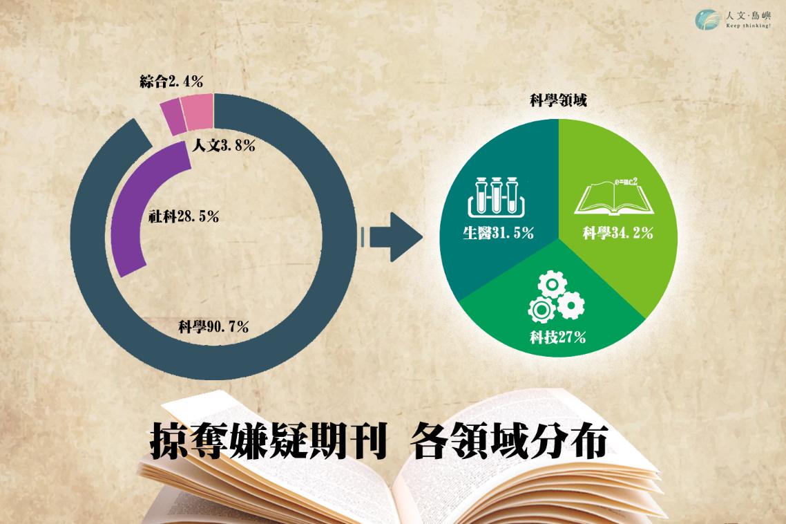 以2013年12月27日為基準點,林奇秀清查出12,606份掠奪嫌疑期刊,其中四成不是連結失效就是空刊,最後剩下7,775本仍「存活」的期刊。這些期刊裡,屬於科學領域的高達九成;其次是社會科學領域,接近三成(跨領域的期刊會重複計算,比例相加大於100%);最少的則是人文領域。在科學領域底下,又屬STM領域,即科學、技術、生醫領域(Science, Technology, Medicine)最受掠奪型出版商青睞。