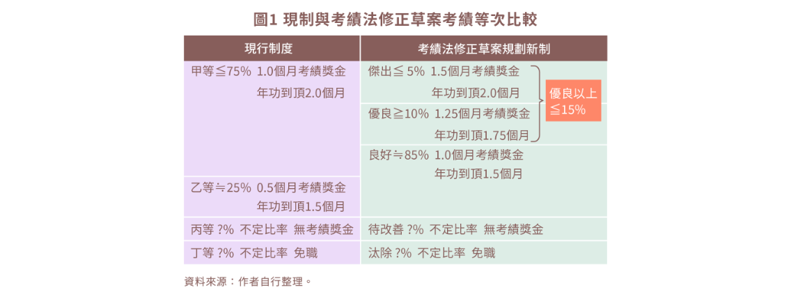 為求獎優,良好以上皆晉敘俸級且均有考績獎金,但優良及傑出者獎金增加一定比例給予,以激勵士氣,並結合陞遷法強調之功績原則,讓表現優良以上者之陞遷可以加快。過去由於俸級已達年功俸最高級者,無論甲乙均加發一個月俸給總額之考績獎金,造成考績甲等未達年功俸最高級者可領一個月,乙等已達年功俸最高級者,卻可領一個半月的奇怪而不合理之現象。即使有人主張這是作為未能晉敘俸級之補償(是否需要補償容有討論空間),也應該區分考績甲乙等而有所差別,否則會造成晉級陞遷者,俸給、獎金合計反少於未能陞遷、原地踏步者之現象。故本次修法在考量總考績獎金規模儘量維持之前提下,作適當比例之調整(如圖1)。同時另予考績也跟年終考績獎金略作區隔,以求公平。當然若國家財政許可,不做上述調整而延續行之有年的制度,也是皆大歡喜的作法。然而,未來的考績獎金,不能視為既得權益,而認為上述調整方向,有減損、侵害個別公務人員的權利。