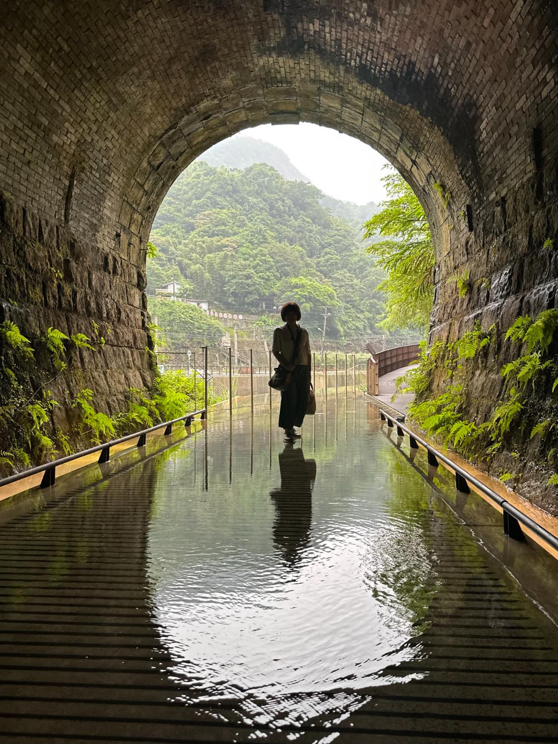 「初步規劃三貂嶺生態友善隧道的時候,原本要依循著單車騎行的方案, 畢竟它全長有三公里多,踏查之後決定以步行做為考量,為的就是臺灣葉鼻蝠。」蚯蚓整合文化總監陳方偉喜歡這段路線的設計,尤其又有專業導覽老師的加乘,帶隊的游宜蓮老師是新北市政府培訓的志工,在地質與動植物研究有專長,帶著旅人漫步隧道能全方位剖析當地的精華,包括可以近距離與臺灣葉鼻蝠面對面,這樣的畫面非常震撼, 岩壁上的鐘乳石也是千百年來的點滴薈萃,以漸層瑰麗的色澤展現在遊客面前。