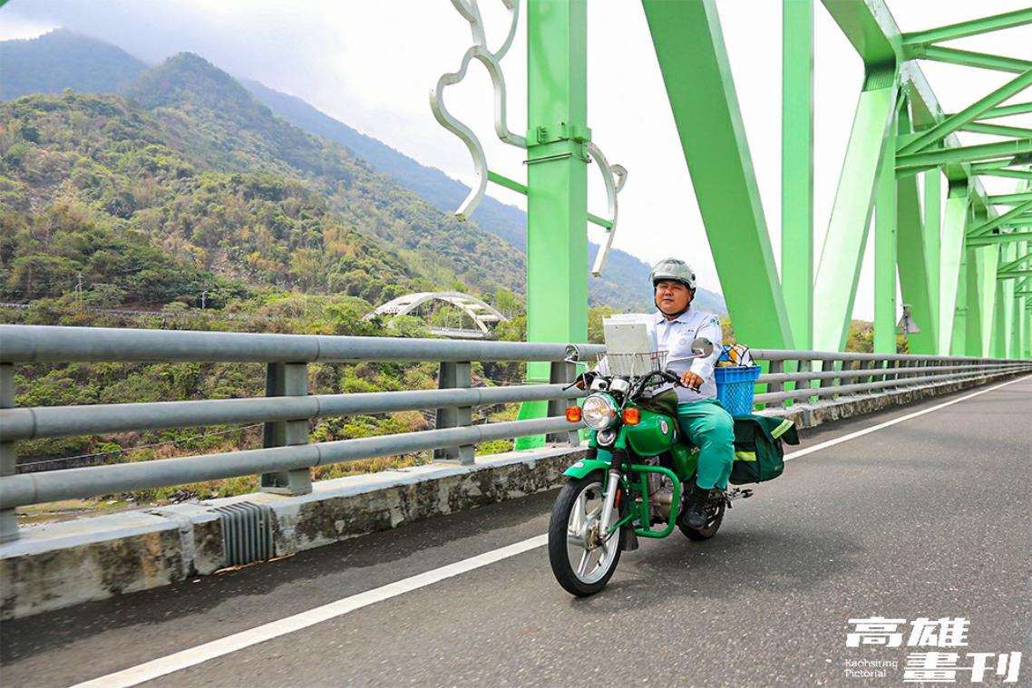騎著綠色檔車,笑容靦腆的杜偉明,在六龜郵局負責投遞寶來至桃源一帶信件,一天長達90公里路程,在蒼翠蜿蜒山路穿梭,看一樣的山陵、騎一樣的路線,彎進街坊巷弄,走進居民日常,體會到的是不一樣的溫暖人情。