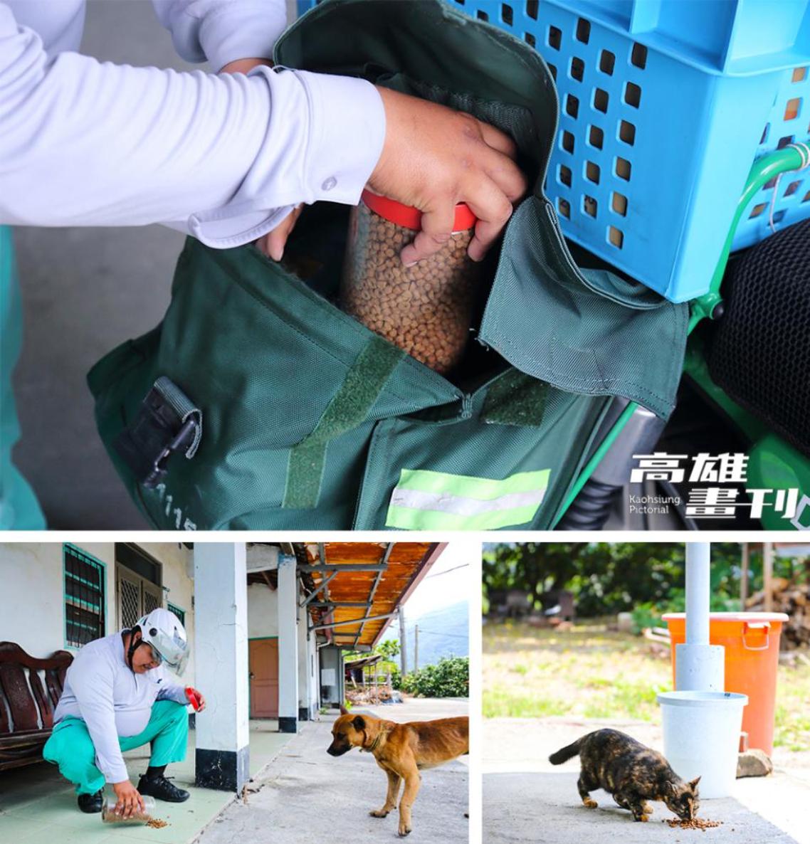 採訪這天,我們跟著杜偉明騎上蜿蜒山路,一個轉彎忽然停下車,只見他默默拿出一個裝滿飼料的透明罐,蹲下靜靜等待,這時一隻玳瑁色的貓探出頭,躡手躡腳出來吃著地上飼料,彷彿與主人相約般熟悉、自然,這罐「神奇飼料」也收服不少沿路上的小狗。原來,郵局不只處理郵務業務,還會另外準備貓狗飼料,讓他們攜帶在路上與貓狗「搏感情」,這些工作外點滴,既紓壓又有趣,一點也不厭倦。