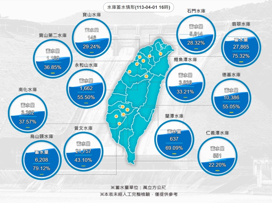 盤點全台水庫蓄水狀況,包括石門水庫(新北、桃園、新竹)28.32%、寶山水庫(新竹)29.24%、寶二水庫(新竹)36.85%、明德水庫(苗栗)31.7%、鯉魚潭水庫(苗栗、台中)33.21、石岡壩水庫(台中)13.8%、霧社水庫(南投)30.8%、仁義潭水庫(嘉義)22.2%、白河水庫(台南)18.1%、南化水庫(台南、高雄)37.57%,蓄水率均低於4成。