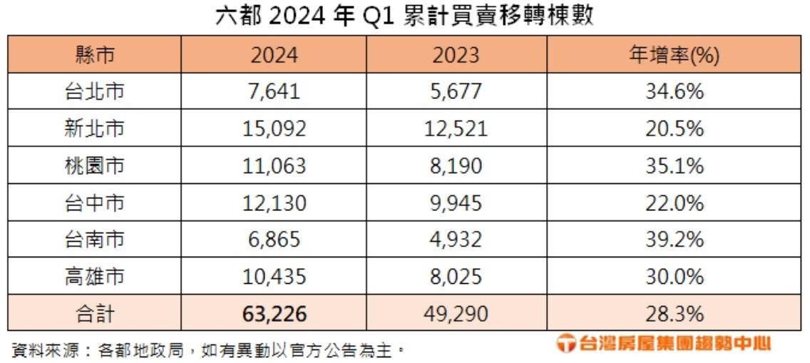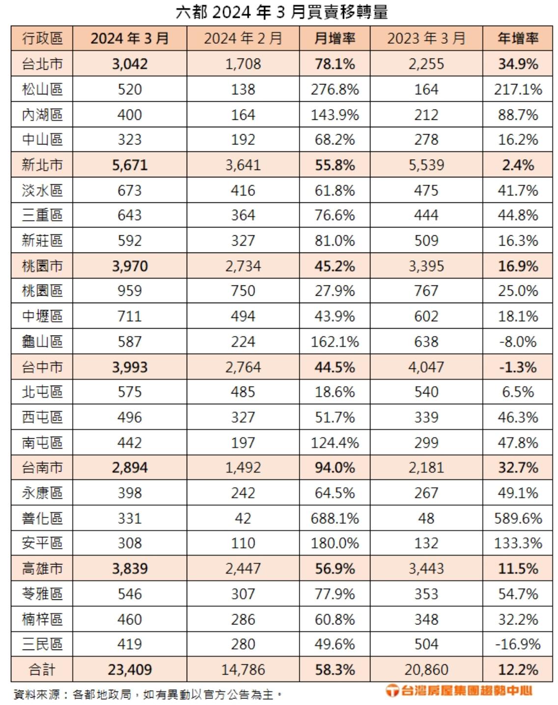 六都今年3月的買賣移轉棟數已公佈,分別為台北3042棟,月增78.1%,年增34.9%;新北5671棟,月增55.8%,年增2.4%;桃園3970棟,月增45.2%,年增16.9%;台中3993棟,月增44.5%,年減1.3%;台南2894棟,月增94%,年增32.7%;高雄3839棟,月增56.9%,年增11.5%;總計六都3月共23409棟,月增58.3%,年增12.2%;累計Q1共63226棟,亦比去年同期增加28.3%。