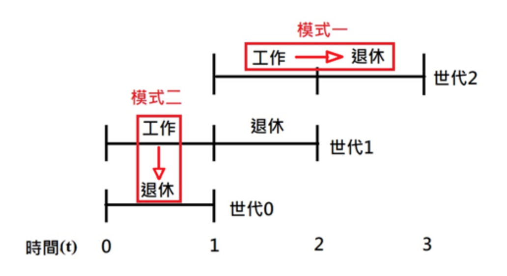 圖中橫軸代表時間而縱軸代表不同世代,箭頭顯示資金流向。假設經濟個體一生分為工作與退休兩個階段。第0期同時存在正在工作的世代1以及已退休的世代0,模式二係由世代1將部分所得提供已退休的世代0生活所需的財源(圖中箭頭由上而下)。同樣,世代1退休後,由世代2工作者提供他們生活所需,如此代代運作下去。而模式一則由個別世代於工作階段透過儲蓄提供其退休期間生活所需(圖中箭頭由左而右)。