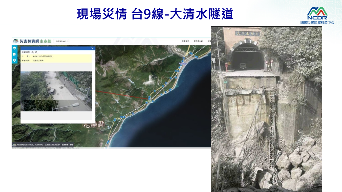 據公路局巡查結果,台9線蘇花路廊有9處 (含台9丁線3處) 落石坍方、台8線中橫公路多處坍方,台11線有2處,台7甲線則有1處,目前台鐵花蓮北上對外交通全部中斷,公路局表示,後續如有最新狀況將儘速公布資訊。