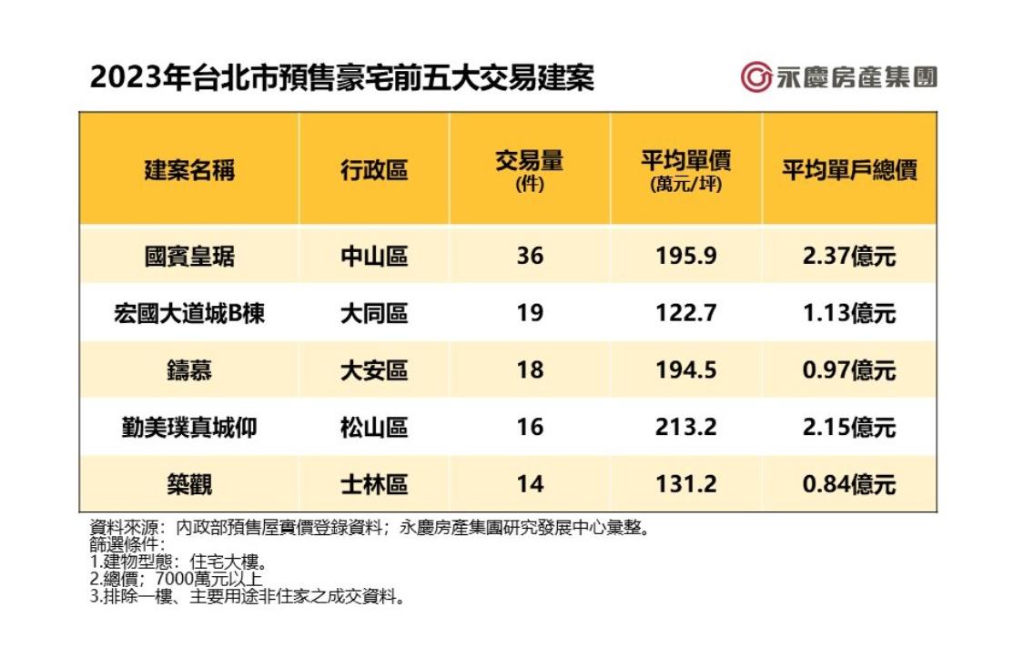 永慶房產集團彙整預售屋實價登錄交易資訊,篩選2023年台北市交易總價7000萬元以上的前五大預售交易建案,中山區「國賓皇琚」交易件數36件居冠最為熱絡,相當於每個月就有3件交易紀錄,而松山區「勤美璞真城仰」去年平均單價每坪211萬元,不僅為前五大建案單價最高,交易量也有15件,是去年表現最有價有量的豪宅預售建案。