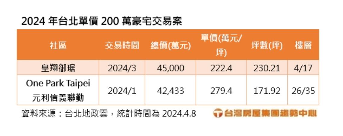 2024年台北市已有2筆單價破200萬元的豪宅交易