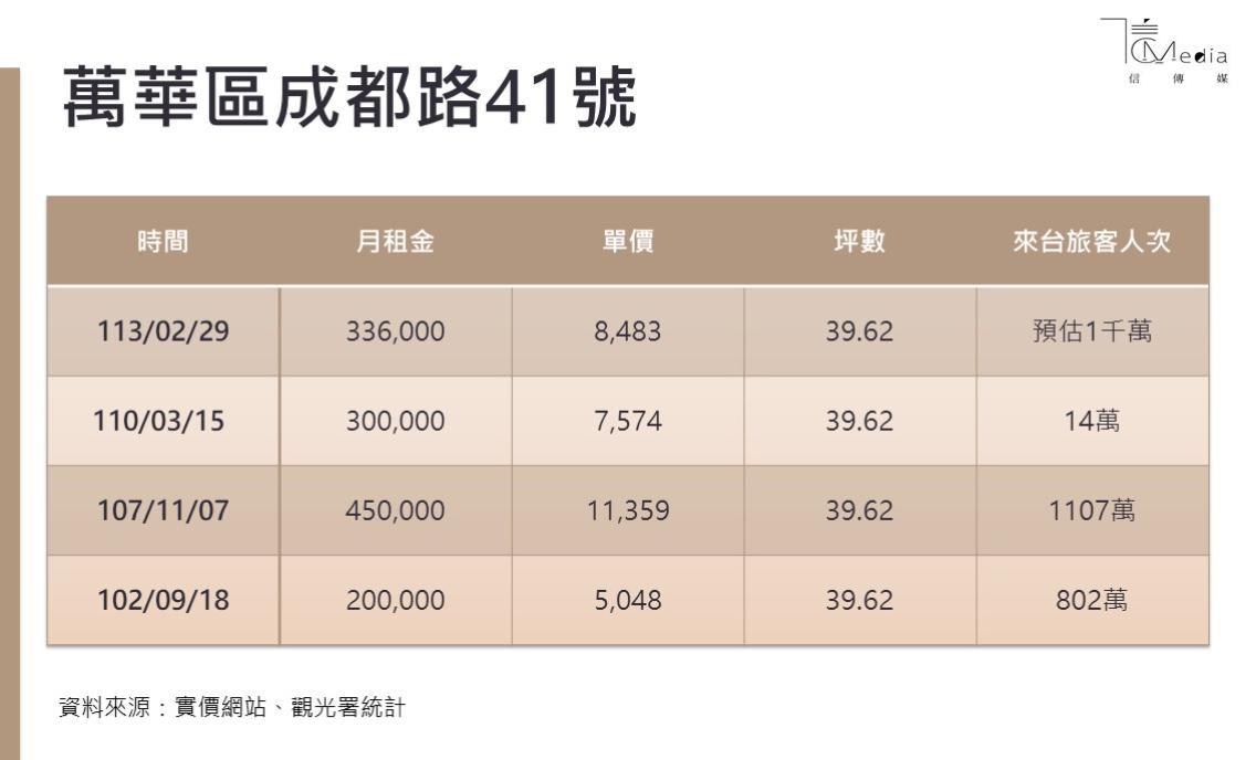 此次揭露是西門町成都路41號,2018年月租45萬元,每坪單價達1.1萬元,當時來台旅客人次有1107萬人,也是西門町的輝煌年代,之後受到疫情開始衝擊,2021年3月月租金降到30萬元,不過當年度就已經訂有租金調漲條款,第一年租金為30萬元,第二年租金為35萬元整,第三年租金為40萬元,第四年租金為45萬元,最後由保養品牌承租。