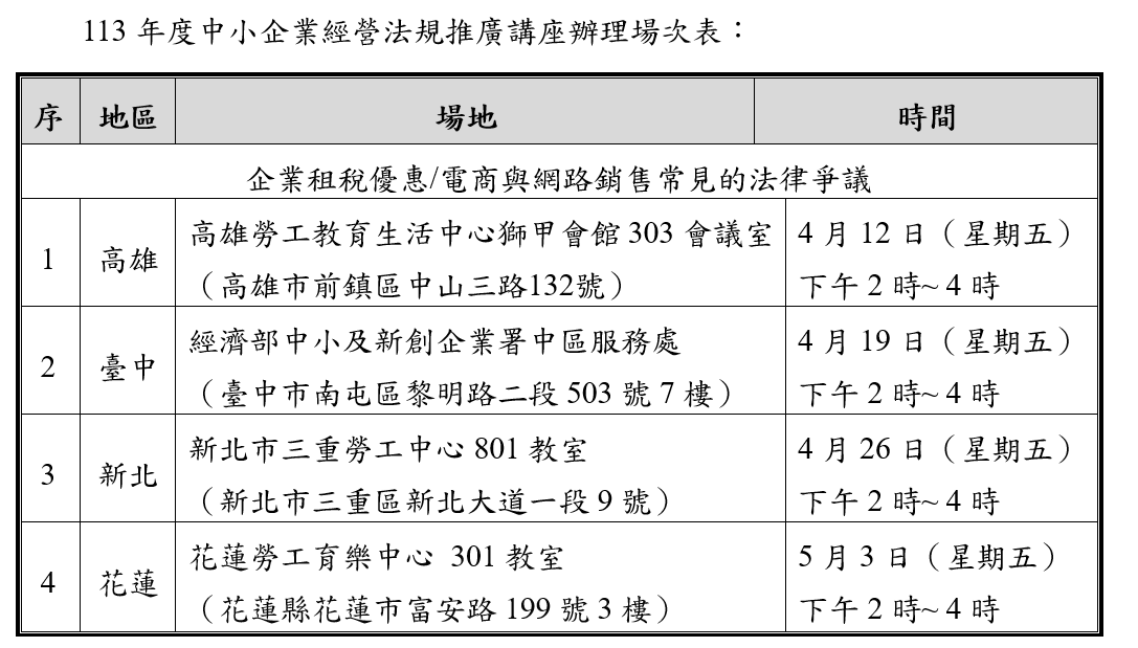 「中小企業經營法規推廣講座」在113年3月27日已於臺北市辦理本系列第一場講座,未來將於高雄市、臺中市、新北市、花蓮縣等地全國巡迴辦理,盼透過實體活動講座說明,解決中小企業困惑之處。講座報名資訊可參閱中小企業法律諮詢服務網,或洽詢聯絡窗口(02)2332-8558#317。