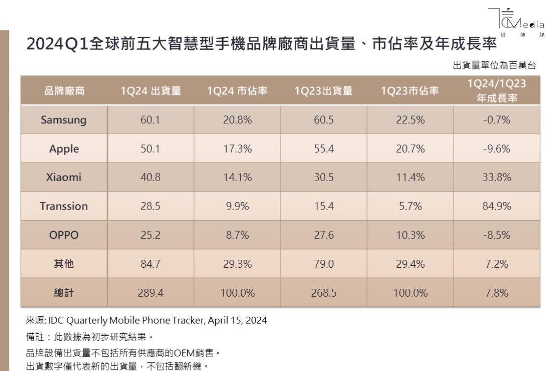 根據IDC最新全球手機季度追蹤報告(IDC Worldwide Quarterly Mobile Phone Tracker)的初步數據統計, 2024年第一季全球智慧型手機出貨量年成長7.8%,達到2.894億部。 雖然由於許多市場仍面臨總體經濟挑戰,該產業尚未完全走出困境,但連續第三季出貨量成長,有力地表明復甦正在順利進行。