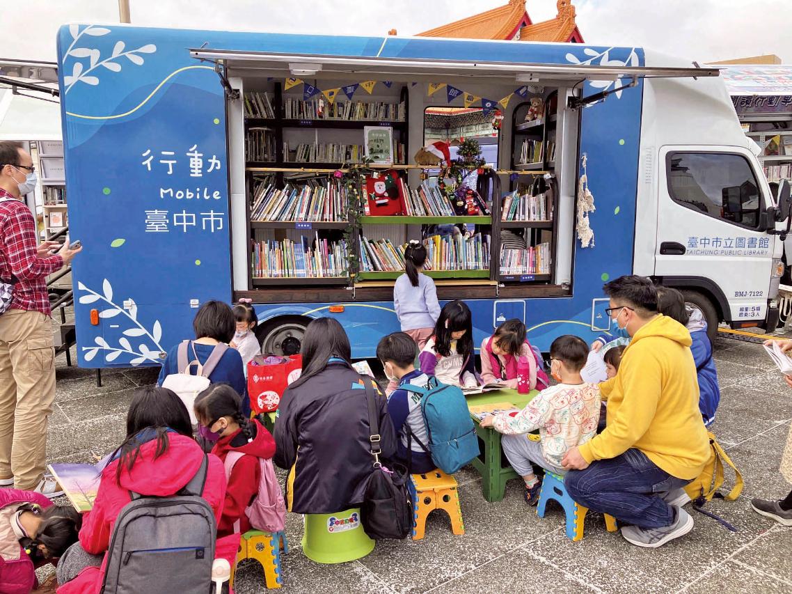 台中市目前擁有7部行動圖書車,每年服務次數約2,000場次。以2023年來看,駐點就高達208處,提供2,153場次服務,其中借書冊數逾45萬冊,數量驚人。