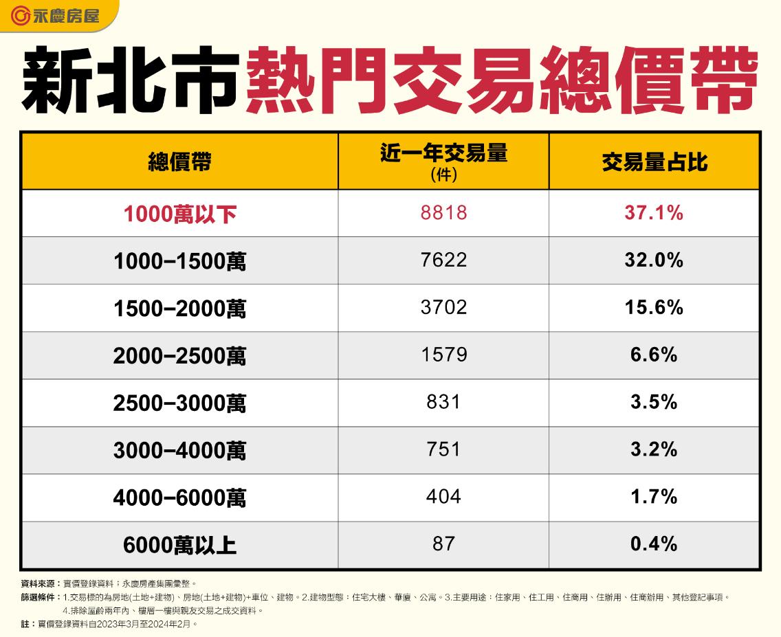 隨著台北人口外擴至新北購屋,新北市房價持續向上攀高,對於有購屋的意願的民眾壓力越來越大。永慶房產集團根據實價登錄資料,統計近一年新北市各總價帶交易占比發現,千萬以下住宅交易占比37.1%最高,那麼,哪些行政區交易最熱絡呢?其中由淡水區拿下交易王寶座,每5件成交就有1件來自淡水;而交易量位居二、三名的則是新莊區、三重區、汐止區。