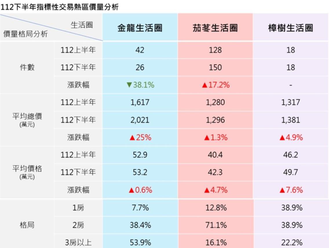 交易件數最多的則是位於新台五路二段尾端的茄苳生活圈,成交量達150件,平均交易總價為1,296萬元,每坪單價約為42.3萬元,較112上半年上漲4.7%,主要移轉面積在19~40坪之間,2房格局的比例則高達71.1%。另位於大同路以北,同興路以東之樟樹一路、樟樹二路及工建路一帶的樟樹生活圈,交易件數為18件,平均交易總價為1,381萬元,每坪單價約為49.7萬元,較112上半年上漲7.6%,主要移轉面積在17~36坪之間,1房與2房格局的比例相當,均為38.9% 。