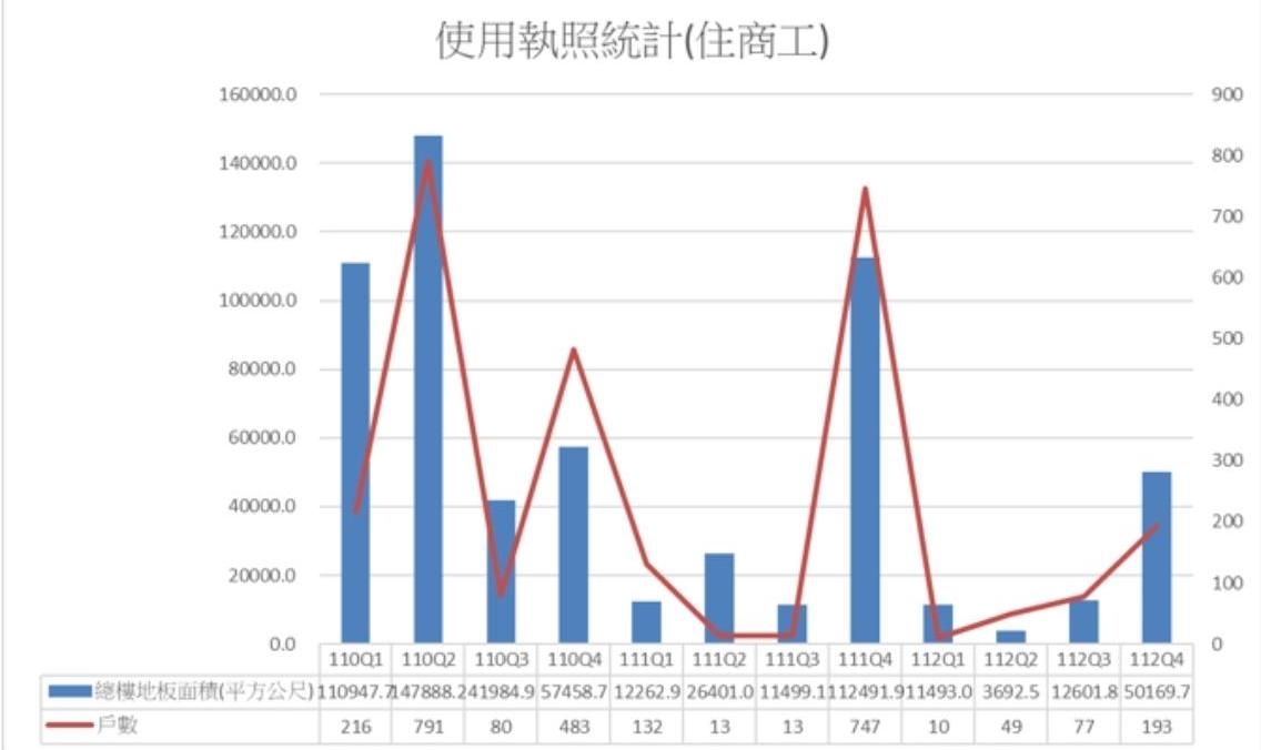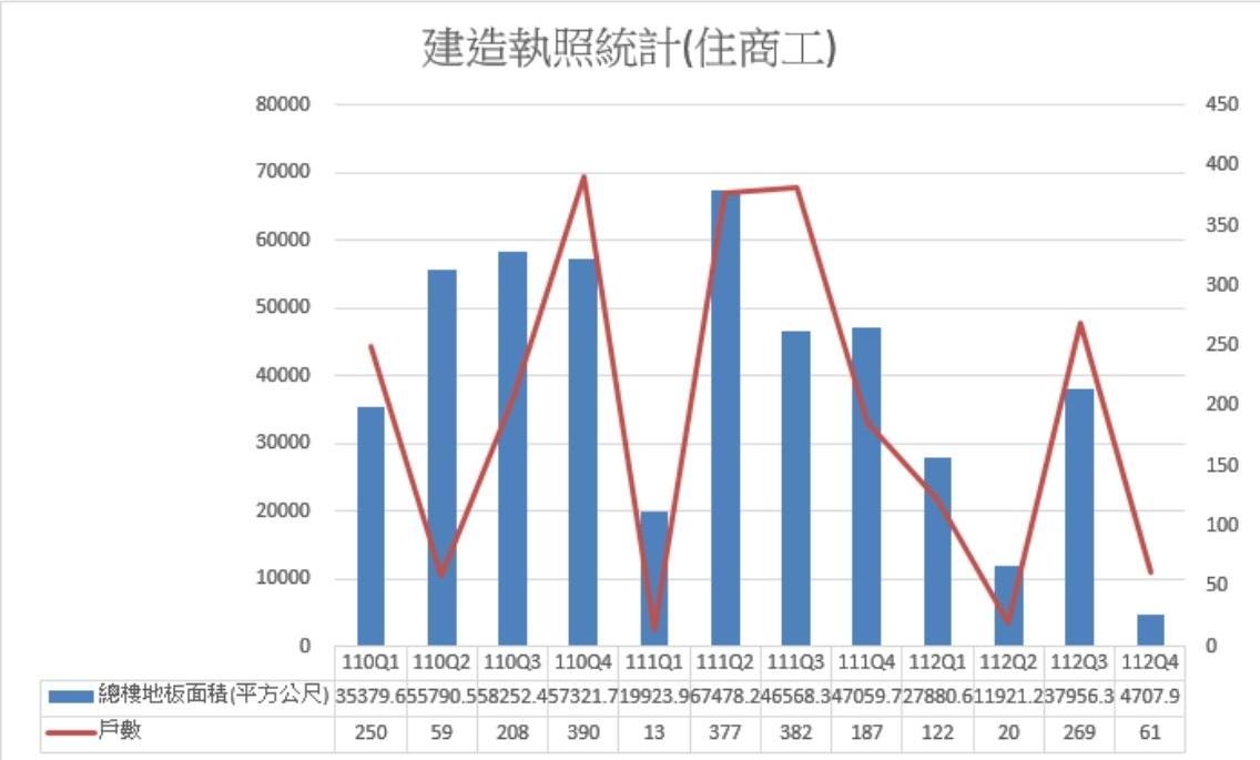 汐止地所補充,分析轄區內(包含汐止、金山、萬里區)使用分區為住商工建造執照、使用執照之數量,112下半年核發建造執照樓地板面積共計42,664.2平方公尺,戶數有330戶,與112年上半年相較雖有成長,但與前年同期111年下半年相較,則分別減少54%及42%;使用執照樓地板面積62,771.5平方公尺,戶數則為270戶,與前年同期111年下半年相較,則分別減少49%及64%,推案量趨緩。