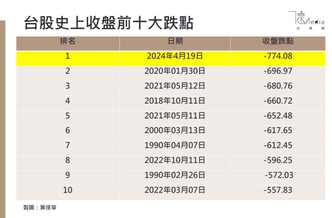 而台股19日收盤仍是大跌774.08點,也一舉衝進台股史上收盤跌點最高首位,攤開過去台股歷史上的收盤跌點排名紀錄,除了今日之外,第二大收盤跌點則是在疫情爆發時、2020年1月30日收盤下跌696.97點;第三大則是2021年5月12日,當時收跌680.76點;第四大是2018年10月11日的660.72點;第五大是2021年5月11日的652.48點。