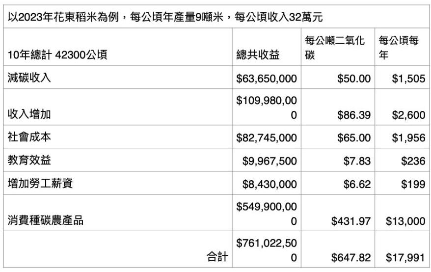 小農種碳則減碳每噸績效可以到達$647.82美元,其中SDG 13氣候行動,每公噸碳交易$50美元;SDG 2 消除飢餓,每年增加產值$86.39;SDG 3健康福祉,社會成本收益$65(依美國環保署2015年估算),SDG4 優質教育,每年增加$7.83美元的效益;SDG 8尊嚴的工作及經濟成長,增加$6.62美元,SDG 12 負責任的消費與生產,產值$431.97美元。合計減碳每噸創造的價值為$647.82美元。如果換算成每公頃土地,每年則可增加$17,991美元。