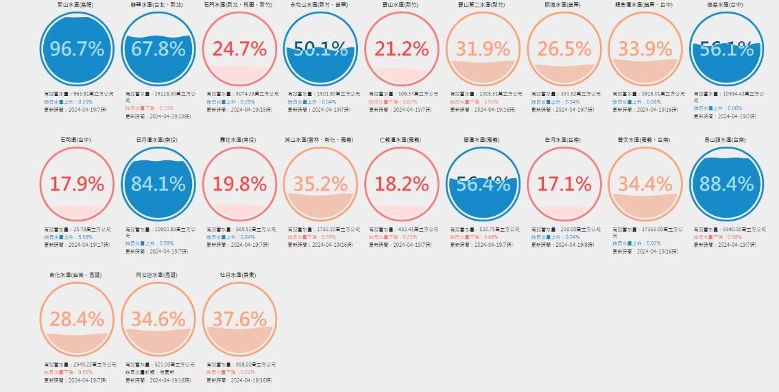 而供給中部地區的水庫也紛紛拉起黃燈,明德水庫蓄水量剩26.5%、鯉魚潭水庫剩33.9%、石岡壩與霧社水庫分別剩18.8%與19.8%,萬幸的是德基水庫與日月潭水庫還分別有56.1%與84.1%的蓄水量,但民眾還是要節約用水,以備不時之需。