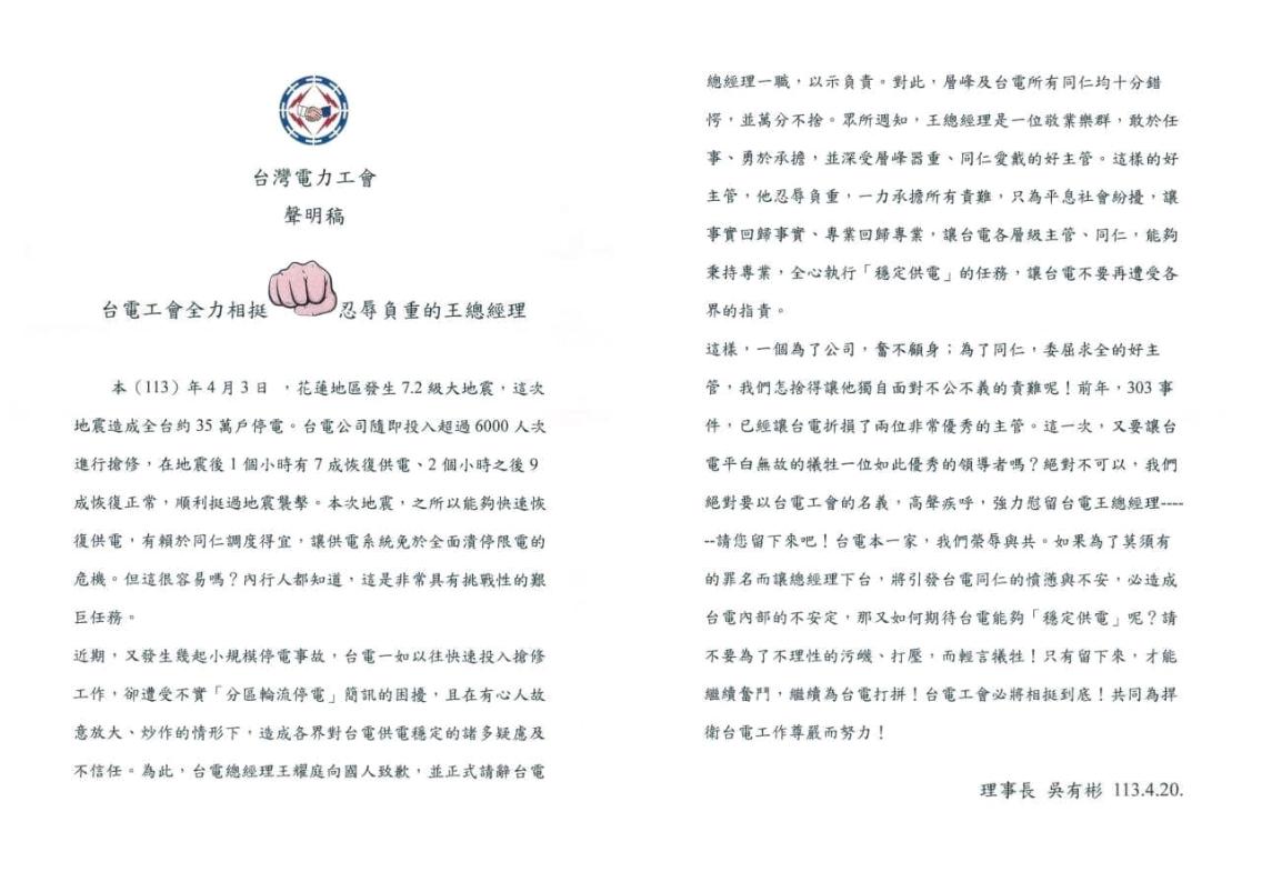 王耀庭接受慰留:繼續捍衛台電同仁的尊嚴