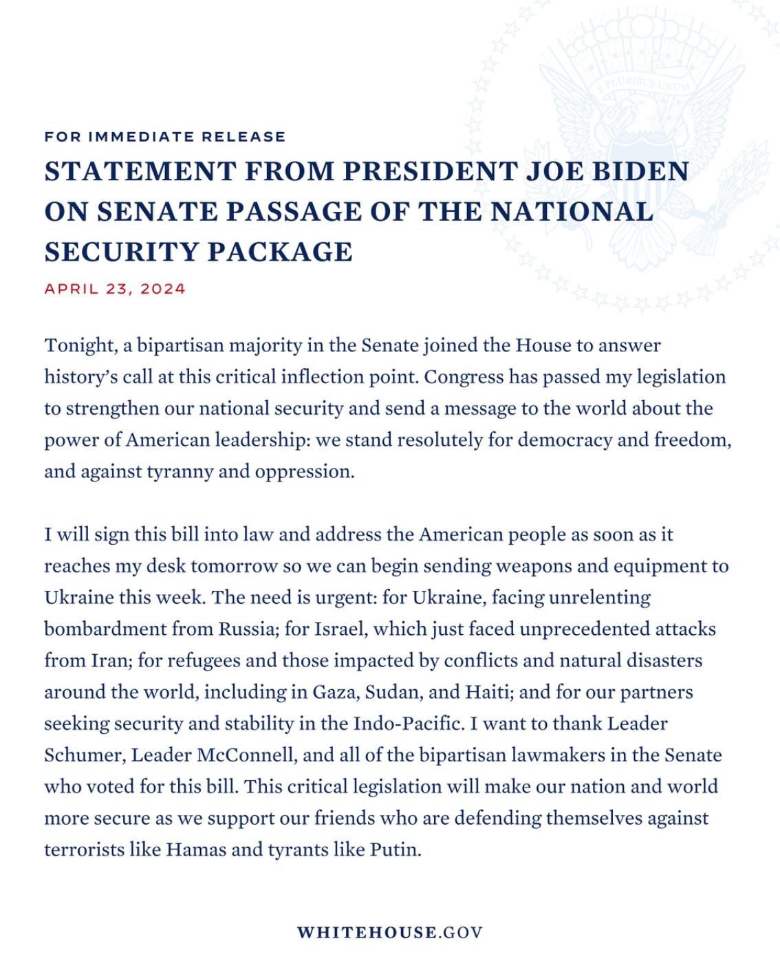 美國參議院今天台北時間24日投票通過了延宕已久的950億美元外援計劃。美國總統拜登在四合一法案通過後發聲明讚揚參議院,並將於明天簽署此案成法, 此案的通過也被視為拜登、民主黨、參議院共和黨領袖麥康諾的重大勝利,儘管共和黨右翼對持續援烏越來越不滿,麥康諾長期以來也一直推動向烏克蘭提供援助,共和黨籍眾議院院長強生也不顧被自家人罷免推翻的下場,在法案被擱置的狀態下再次主導眾院表決。