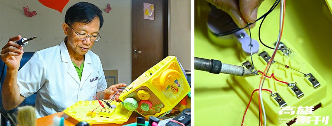 推了推老花眼鏡,仔細研究玩具內部構造,從電子公司退休的蘇顯榮,6年多前偶然一次機會,修好孫子壞掉的玩具,當時念頭興起:「有沒有可能幫其他孩童修玩具?」在全家人鼓勵下,一同設計LOGO、架設網站與維修流程,「蘇爸玩具醫院」迅速開張,穿起胸前繡有「蘇爸玩具醫院」的白袍,不是幫人看病,而是修復每個乘載回憶的玩具。